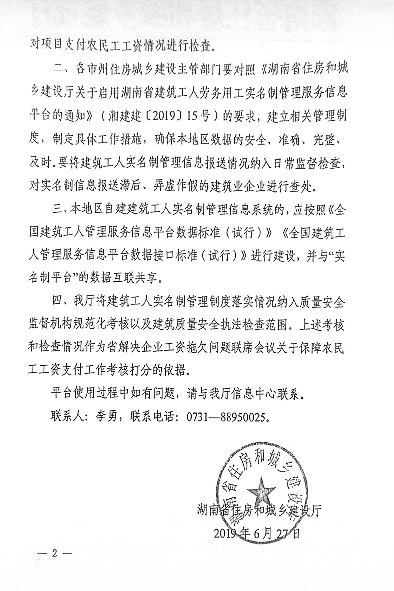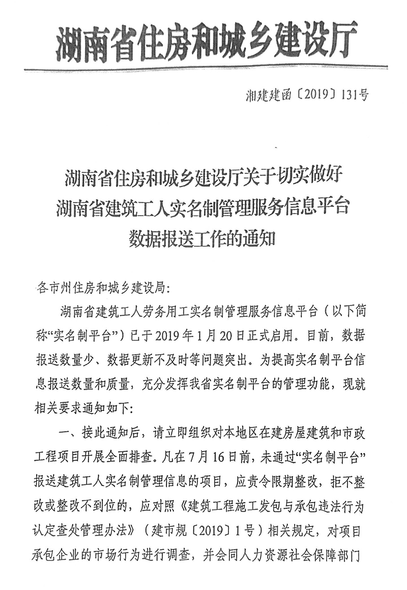 關于切實做好湖南省建筑工人實名制管理服務信息平臺數據保送工作的通知
